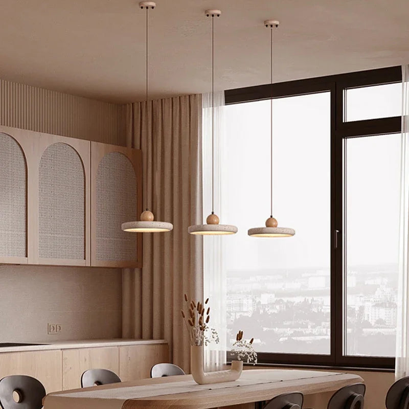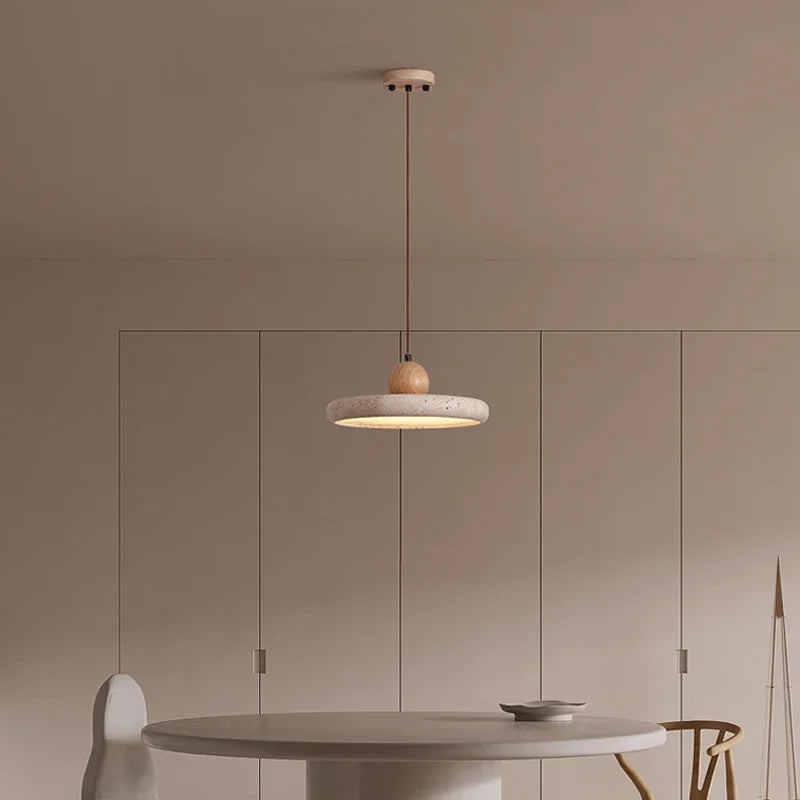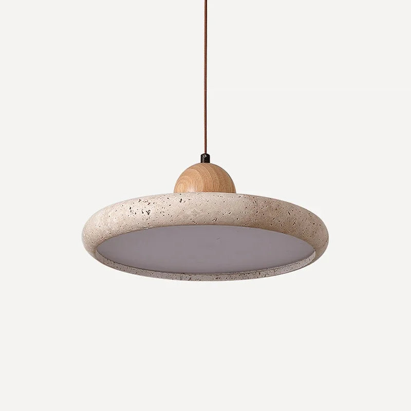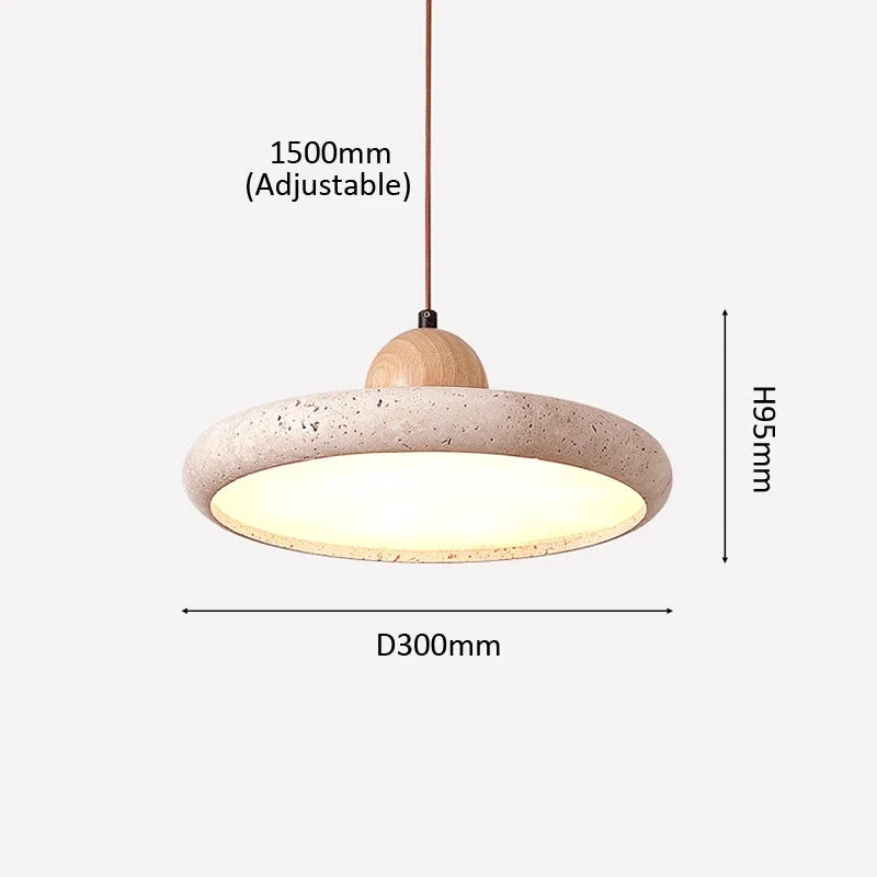Modern Minimalist Wabi-Sabi Yellow Travertine and Wood LED Pendant Lamp ⌀300×H95 mm